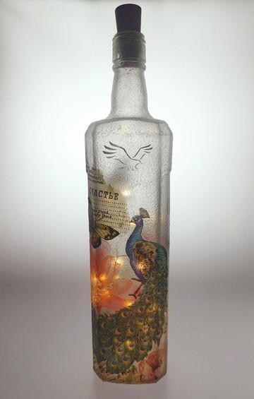 藍雀的貴氣與蝶戀花的繾綣,領著高貴與雍容,帶來優雅的品味生活。酒瓶燈是一種用酒瓶創作的創意家居裝飾品,製作成具有照明功能的裝飾燈,可以為室內創造獨特的氛圍。匠心獨具以蝶谷巴特之技法取代畫筆,每個酒瓶變身畫布,刻劃著故事,揮灑著情感,成為有故事有夢想陪著主人一起成長的心靈燈飾,買來送禮更能讓祝福含意深遠,讓情意濃密綿長,使雙方的心燈更能彼此點亮。【尺寸】:7.5x6x33(長x寬x高,單位為公分)【重量】:約631公克 【材質】:玻璃酒瓶、蝶古巴特專用餐巾,沾染灰塵時請吹除或以微濕布輕輕擦拭。【使用方式】:做為擺飾或燈飾。【購買注意事項】:1.出貨前均會檢查燈具是否能正常點亮。2.商品皆附三顆LR44電池。