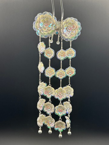 這是一隻主打華麗而輕盈的髮簪,由於十分輕盈,很適合舞台表演使用。亮片花在不反光時便十分美觀,反光時更是五光十色。做工精緻的亮片花在市場上難得一見,做成流蘇的更是少之又少。