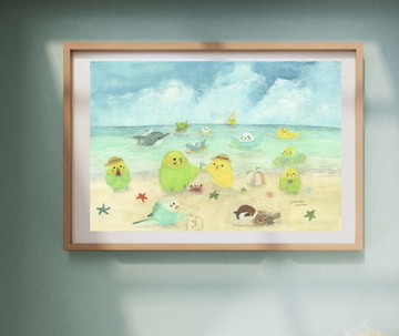 A4 暑假 長尾小鸚鵡 大海 自然 風景畫 虎皮鸚鵡 麻雀 小鳥雀
