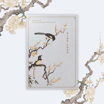 享受藝點美感生活 Let's ART in your Life !只想把最好的祝福,送給最特別的你。溫暖而誠摯的問候,在每一個值得珍惜的時刻。|設計理念將花卉盆景的吉祥寓意融入典雅的莫蘭迪配色,搭配新古典中式的線框設計, 萬用卡設計既簡約又保留了傳統的典雅韻味。讓團花吉語化作祝福,隱藏在卡片中, 寄予親愛的家人朋友。|本商品創意由國立故宮博物院正式授權 - 元 織雙喜圖 軸正式授權商品均貼有國立故宮博物院雷射防偽標籤This product is authorized by the National Palace Museum.Authorized products are all affixed with the National Palace Museum's laser anti-counterfeiting label.白地設色織。兩隻喜鵲棲於梅花枝上,相互凝望,狀至親密。幅右方色織詩題:「曉風香萼獨開遲,雙鵲娟娟報喜時;最是上林芳信早,分明春在萬年枝。」織款:華陽王曉。織印一:王曉。無款印。此幅設色清雅,技巧穩健。喜鵲姿態寫實傳神,而梅幹之彎曲與梅花之結組自然富有生意,構圖疏朗,典雅明快。|規格說明尺寸:H33.3cm×W27.8cm包裝材質:OPP袋商品材質:美術紙商品入數:1入