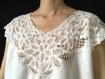 袖口.下擺和領口乃至延伸到前後身片的圖樣不對稱設計,皆由帶狀蕾絲結合刺繡縫製而成,此種耗時且獨特的技法,後來也成為文藝復興蕾絲形式之一。可前後反穿, 白天穿一面,夜晚展露另一面。商品狀況良好,近全新。布料:100% 棉身片和蕾絲裁片一體成形,無肩寬。胸圍平量:21.5″衣長平量:24″♡購買前提醒♡商品皆經由上昇處女嚴格篩選, 如有瑕疵也會在描述中說明老品本身帶著歲月痕跡, 完美主義者請勿下標如有任何疑慮, 歡迎於下標前詢問__商品通通只有一件,猶豫有時是會誤事的____貨物售出, 概不退貨__