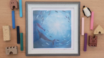 【海。四色 仰望海面與動物們】這幅畫是潛水員的視角,由海中往海面看,看到向四周散出的陽光,以及魚群與海豚。夏天的季節是屬於海洋的日子,是奔放不羈、浪花飛散的海,是靜謐無聲、緩緩輕握住腳趾的海,是我們的海,也是屬於動物們的海。「海。四色」使用溫潤色粉的粉彩,以手指沾染各色色粉,畫出海洋的光與影、亮與暗,包含不同色澤,呈現海的各種變化與面貌。小塗鴉獨家畫作,每一幅均為獨特作品、無法完全相同,均有各自相異風格之處。種類/ 粉彩畫材質/ 160磅圖畫紙;木框(擺/掛)尺寸/ 畫 15x15cm;含框 18x18cm重量/ 200g 含框