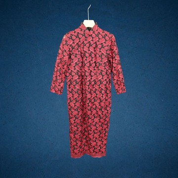 二手 古董訂製 酒紅 緹花 長袖 旗袍 PF1130