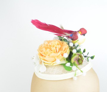 以網紗為基底,綴飾著一隻紅羽鳥,以及橘白漸層的絲質花朵。頭飾基底為寬13公分的象牙白色圓盤,整體高度約9公分。透過髮夾固定。您將收到照片中的實品。已盡力呈現商品最準確的色彩,但實際顏色可能因您的螢幕設定而有些微差異。若您需要客製化設計或有任何疑問,都歡迎隨時與我聯繫。購買此商品,即表示您已完整閱讀商品說明並同意本賣場政策。感謝您參觀我的賣場。親親Elle