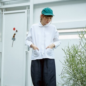 麻長袖彼得潘領襯衫 - 白色