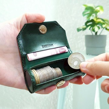 嗨~歡迎光臨 Destiny 命定革物|第三十二吉室|,我是室長Lina你是否有過這種經驗?排隊結帳時,因為零錢掏半天,而被收銀店員或排隊隊伍行注目禮,本來低調的你瞬間成為目光焦點…之後,為了不耽誤結帳時間,每次付現時只好使出「鈔」能力,雖然解決了一時的麻煩,但也讓零錢越積越多,得幫「孔方兄」想個好出入…**【設計概念】**「一筒金零錢包」的筒狀造型來自於相機底片罐,小時候室長Lina爸都會用底片罐裝零錢,放在車上備用,覺得蠻方便的,於是以此作為設計發想。**【商品說明】**一筒金零錢包,筒狀造型,一手掌握的大小,從1元到50元,可以把零錢排得整整齊齊,付錢時一目了然,解決零錢掏半天的窘境,不再堆積零錢,讓零錢有個好出入,是收納強迫症及零錢囤積症的心頭好物。夾層最多可放2張鈔票,側有圓環扣,可掛於包包、褲頭等。**【顏色】**◆ 苯染植鞣革,顏色超深的墨綠色,相對來說比較不怕髒,而綠色也是招財色,推薦給各位室友◆ 五金:金色(預設) / 銀色 / 古銅色→五金預設為整組金色,如需更換為銀色或古銅色五金,請先詢問有無零件可換**【其他顏色】**想看其他顏色嗎?歡迎到我的設計館逛逛→pinkoi.com/destinyleathergoods如果看到自己的命定色售完,真的超想買的話,可以直接以站內訊息問問室長Lina或按下「我要排隊」來許願,這樣我就知道下次預購要製作什麼顏色囉!**【材質】**◆ 天然植鞣革(皮面防潑水處理,微亮面)◆ 內裡為防潑水布◆ 磁扣:鐵+合金◆ 360度旋轉和尚頭:黃銅+高品質電鍍◆ 圓環扣:鋅合金電鍍**【尺寸】**◆ 零錢包本體:約 長 8.8 cm /寬 3.5 cm /高 3.5 cm加側邊 旋轉和尚頭+圓環扣:長度約增加 4 cm(圓環扣拉直測量)◆ 圓環扣 內直徑:約 1.9~2 cm /線徑:約 3~4 mm /開口:最大可開至 1 cm※ 五金零件如遇廠商缺貨,會使用相似的五金替代,形狀尺寸和商品圖可能會有一點點差異,但不會差太多。**【內容量】**◆ 最大可放 NT$50 硬幣(直徑約 2.8 cm 的硬幣),但因為中間磁扣處結構稍厚,所以建議放兩旁。◆ 內部空間長度約 41枚 NT$10 硬幣疊起的厚度(約 7.6 cm)◆ 上蓋夾層最多可放2張新台幣鈔票(短邊為 7 cm 的鈔票,長邊需對折2次)**【淨重】**約 32 ±5 g**【商品特色】**◆ 筒狀淺口設計,一手可掌握的大小,容量足,零錢可立起來,好取用◆ 上蓋夾層可放2張鈔票,以備不時之需◆ 強力磁扣設計,強力夠,好開闔◆ 360度旋轉和尚頭+圓環扣,掛於包包、褲頭時,可360度旋轉,不用擔心方向性◆ 亦可收納其他小物,如印章、口紅、小飾品等**【使用時機】**◆ 適用於各種「只需銅板價,就能解決」的時刻,例如去超商取貨、買手搖飲、買便當…各種只是出去一下下,卻又懶得背包包出門的情境。室長我經常只裝一些零錢、2張百鈔,把「一筒金零錢包」掛在褲頭,鑰匙放在口袋,兩手空空就出門了,這樣的好處是「絕對不會不小心花太多錢」。◆ 又或是你跟室長我一樣,習慣將鈔票和零錢分開放,就可將「一筒金零錢包」掛在包包裡面,付錢時只需伸手一抓,不會撈來撈去找不到零錢包,很方便的。**【使用方式】**◆ 一筒金零錢包的主要目的是「好使用零錢」,所以建議最多只裝8分滿就好囉!千萬不要把它當存錢筒使用,如果全裝滿的話,一來會太重,長久吊掛可能導致包體側邊變形,二來沒有空隙,反而不好拿取零錢,三來上蓋夾層若有裝鈔票,零錢又裝太滿,會蓋不起來。要記住,讓零錢有出有入,才是零錢包的正確使用方式,否則你該選擇的是存錢筒。◆ 收到零錢時可以照大小排列,靠近圓環扣的地方放1元,遠離處放50元,掛起來才不會頭重腳輕,找錢時也較一目了然。◆ 使用中可能因為搖晃,導致硬幣順序亂掉(很大力才會),但因為筒狀造型,就算亂也是「亂中有序」,只要稍微前後搖晃一下,讓硬幣立起來,集中在一側,還是很好取用的。◆ 建議上蓋夾層放2張百元鈔就好,雖然千元鈔也放得下,但如果找回很多百元鈔,就放不下了,除非你有另外的鈔票夾,或本來就要付千元。◆ 請將「一筒金零錢包」掛在安全的地方,使用後記得「按壓一下」磁扣,發出「啪」一聲,確定上蓋關好關滿,不然會上演「撿錢囉~」的戲碼。**【製作細節】**◆ 皮面有防潑水處理,微亮面◆ 皮邊有封邊處理,不會毛毛的◆ 有防潑水內裡布◆ 底層及側邊內部有加固,支撐性足夠,不易變形◆ 360度旋轉和尚頭與包體之間,以螺絲鎖固,不易旋開脫落**【如何保養】**◆ 皮面防潑水處理並非完全防水,只是剛噴到水時會形成水珠,吸水速率比較慢,若不慎沾到水,請使用乾棉布立即擦乾,再放置陰涼處陰乾即可。◆ 最好的保養方式就是天天使用,手部的油脂就是天然的保養油,植鞣革皮件使用一段時間後,顏色會漸深,光澤會越來越溫潤,也可能不小心產生刮痕或水痕,但這也是它獨一無二的原因,記錄著使用者的故事、經歷、喜怒哀樂,就像人生的各種經驗和緣份,造就每個獨特的你/妳。◆ 若長久不使用,請將表面灰塵用乾淨棉布擦拭乾淨,定期上皮革專用保養油(如:貂油),待油脂吸收、陰乾後,收納於防塵袋中,注意防潮防水,保持通風勿擠壓。**【商品包裝】**品牌小吊牌+紙盒+棉紙內襯+品牌小卡,儘量以可回收材質進行包裝,紙盒外會用重複利用的氣泡紙或回收紙板做保護,再放進破壞袋,不華麗、不過度包裝,但該有的都有,收到時就像在拆禮物,不管送禮自用都很適合喔!**【注意事項】**◆ 本商品為「預購商品」,付款
