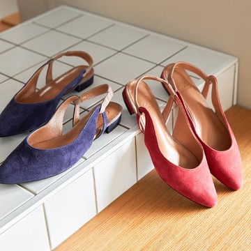 全真皮簡約素面後提帶尖頭粗跟鞋