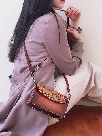 簡約手作植鞣皮革雲龍紋斜背包/側背包