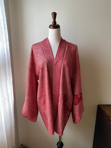 ·總絞染花籬古著羽織·『絞染』為日本和服羽織的一種特殊技法,其工藝繁複,製作出來之後會在使用這技法的區域有浮凸的立體感。· 整塊布面都使用絞染技法,稱作『總絞染』,最為耗工費時:製作時先將布料大抵擬定圖案區塊,並將預計要做成絞染的部份以特殊技法紮起,其餘未紮的部分染上底色,之後再將紮起的部份手工上色或染色……·整件羽織皆有對齊圖案,如一面畫作:自圍籬後綿延生長而出的花季。·此品為完整;內襯為牡丹波紋圖案。·材質為真絲。·實品色如人台圖(後部細節因放置榻榻米與室內白光燈或黃昏而有失準)·尺寸: 肩:Free 袖長:47cm 總長:74cm