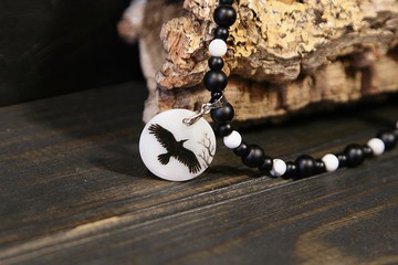 烏鴉或烏鴉項鍊,另一邊有愛情符文。珍珠層珍珠吊墜