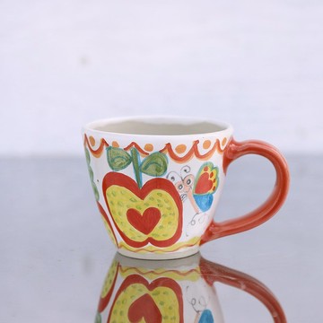 陶器 手工 手繪 獨一無二直徑8.2~8.5cm 高度7.2cm這是一個紅蘋果(裡面是黃色)的杯子,看起來像一張擬人化的臉,幽默的蝴蝶,還有無釉白釉陶瓷上的花癡。柄部施朱紅色釉。它不像您在圖片中看到的那樣是完美的圓形,它略微呈橢圓形。我希望使用它的人會感到明亮開朗。為什麼不用這個杯子休息一下呢?只要一點點,你就會感覺好些。* 與瓷器不同,陶器(土壤)具有柔軟溫暖的表面。此外,可能會有針孔(釉上的孔洞)和小的釉面剝落,但使用時沒有問題,但這也是“陶器”的特徵,我們希望您將它們視為一種品味。粘土特有的不完美之美很有魅力。陶器因為是陶器,拿在手上的時候,比照片上的那個更有土氣的感覺。但是,只要一開始就習慣了,就會感受到真實的質感和簡潔。* 根據您使用的設備,圖像和實際產品的顏色可能不完全相同。我使用個人電腦進行圖像調整和顯示操作,但智能手機看起來更生動。最近,我們正在嘗試將顏色與智能手機相匹配,但請理解圖像與實際顏色之間的差異。.