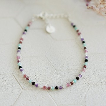 美麗的天然石,色彩多變瑰麗,人工合成珠子完全無法比擬細看天然石,有著不同的紋路,有的透亮,有的帶有雲霧或冰裂紋這款採用六款天然石紅石榴石、紫水晶、天河石、粉紅碧璽、黑瑪瑙及月光石中間搭配925純銀碎片交織成美麗且獨一無二的手鍊< 三種尺寸 | 適合大人與小孩 >大人尺寸為延長鍊設計,方便調節尺寸,銀飾可碰水,可長期配戴不用取下。小孩尺寸為彈性線設計,穿脫方便,可於吃飯、玩泥土、游泳前取下。 | 產品說明 | ✔材質:925純銀/紅石榴石/紫水晶/天河石/粉紅碧璽/黑瑪瑙/月光石✔尺寸: 天然石直徑約2mm/ 三種尺寸【大人尺寸M-16+3CM / 小孩尺寸S - 彈性線14.5CM / 小孩尺寸XS - 彈性線13CM 】✔限量款式售完為止✔天然寶石每一顆形狀、顏色、大小皆有不同 | 圖片資訊 | ✔所有圖照皆實品拍攝✔model手圍大人約14.5cm /小孩約11cm (配戴小孩尺寸XS) https://live.staticflickr.com/65535/52803270440_ec676f94d9_o_d.jpghttps://live.staticflickr.com/65535/52803120829_26f11dbb02_o_d.jpghttps://live.staticflickr.com/65535/52802307067_ae502fed2f_o_d.jpg https://live.staticflickr.com/65535/52802307032_d1fcccf0dd_o_d.jpghttps://live.staticflickr.com/65535/52803120784_a60e551b36_o_d.jpghttps://live.staticflickr.com/65535/52802307047_b32e8fb157_o_d.jpg