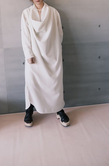 - draped and raw edged neckline- oversize shoulder- curved hem- french seams- 65wool, 35% polyester- color: cream- style: T22AWD004measurements: (one size, model is 160cm)length from center back: 132cm / bust: no limit / shoulder width: 52cm / sleeve length : 50.5 cm / waist: no limit / hip: no limit