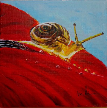 馬蹄蓮上的蝸牛 原創油畫 獨一無二