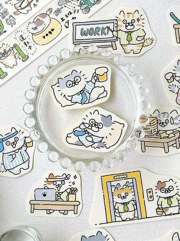 這系列收錄了喵咪們的逗趣日常,色彩是選用輕鬆的黃綠、藍粉為基底,拼貼出好玩的生活感!<喵咪努力中>喵咪加班中幫喵咪穿上了上班族的服裝,呈現喵咪們努力工作的認真場景,儘管很努力,還是偶爾搞砸的逗趣感(有認真就精神可嘉了啦!)色彩選用了輕盈的黃綠色系,給你的生活滿滿加油!<喵咪偷懶中>喵咪下班啦有喵咪下班後喝酒放鬆的逗趣模樣,喝醉必須把領帶戴在頭上,必備台詞就是再來一杯!色彩選用了藍與粉的柔軟色彩,心情上一起好好放鬆吧~材質:每包共8張不同圖案,白底貼紙上霧膜尺寸:包裝總長10x10cm,單圖貼紙約3x4-3x5cm不等以夾鏈袋包裝,可重複使用放入其他手帳拼貼小物3小喵咪由三隻貓咪組成的插畫品牌,透過貓咪畫出生活中的小事,偶爾偷懶、煩躁、調皮、耍賴、自我,希望大家透過3小喵咪也能看到一小部分的自已。喜歡平面圖文插畫,也喜歡畫成幽默的四格漫畫,最近在嘗試小動畫,看著喵咪動起來覺得很有趣!instagram:3.little.cat