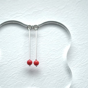 紅珊瑚 圓珠 線條 長款耳環 925銀