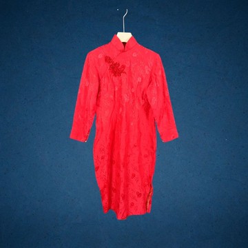 二手 古董訂製 酒紅色 絨布 壓紋 兩側開衩 無袖 旗袍 CA801