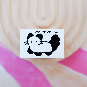 這是一枚會發出「喵~」叫聲,尾巴蓬鬆的貓咪印章。以蓬鬆柔軟的貓咪為靈感繪製。尺寸:3 x 2 公分,高 2.4 公分