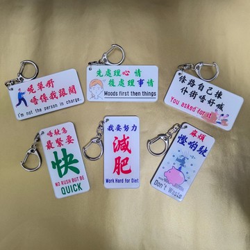 商品編號:K04 呢單嘢唔係我跟開 I'm not the person in chargeK05 先處理心情, 後處理事情 Mood first then thingsK06 條路自己揀, 仆街唔好喊 You asked for itK07 唔駛急最緊要快 Don't rush, but be quickK08 我要減肥 Work Hard For DietK09 麻煩慳啲駛 Don't Waste將告示牌轉化為較細小嘅匙扣,提供另類選擇。UV 透明膠片 ,77mm x 38mm*照片與實物在顏色上或會有少許偏差,貨品顏色以實物為準