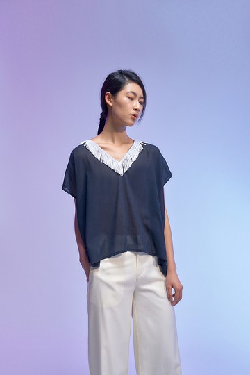 白流蘇 黑V領上衣