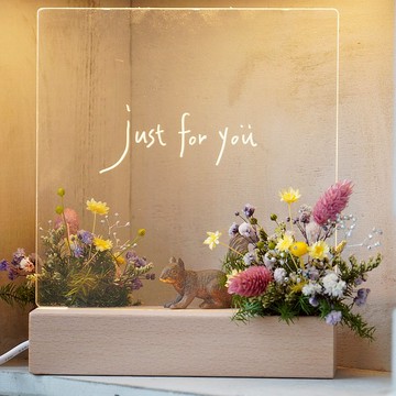【LED 燈座】透明清新LED發光留言板座無論是居家或辦公,都需要用上留言板,提醒交辦各樣事項。當然也可作為告白/求婚武器(咦!非常實用的透明壓克力留言板座,不僅可以書寫也能貼上照片,把各式各樣的事物寫在留言板上吧!非常適合送禮自用,適合放在任何地方裝飾。(喔!還能當作床頭小夜燈)◆ 壓克力透明板尺寸:15x15cm;底座材質:實木;底座燈光:暖色壓克力板上有一層保護膜,必須先撕掉才有透明的效果。(註:壓克力板使用久都會有刮痕,放在深色背景中會讓刮痕明顯,建議在白牆背景前使用刮痕較不明顯喔!)https://live.staticflickr.com/65535/52100777330_61ec5fd858_b.jpg▲使用範例照(註:可以使用衛生紙或擦拭布,擦拭白板筆重複書寫。)https://live.staticflickr.com/65535/52100518009_6b7f29eaff_b.jpg▲底座電源:USB電源(使用行動電源、電腦主機均可);附上白板筆2支和擦拭布1個。https://live.staticflickr.com/65535/52099249537_14d2315994_b.jpg【商品資訊】- 所有商品皆為老師純手工製做。- 因每朵花的姿態都不同,成品皆為獨一無二。- 如有特別喜好歡迎寫信客製商品,亦可代寫留言小卡片。【花材選用】- 不凋雪松、不凋滿天星、加那利、小星花、鈕扣菊等。- 若是訂製商品會依當季花材為主,主要風格與色系不變。- 永生花皆採用日本「大地農園」品牌。【商品尺寸與包裝方式】- 留言板座尺寸約15x15cm。- 本商品包含禮品包裝。- 本商品寄出時將有完整的防撞包裝,以防運送中受損。【保存方式】- 乾燥花/永生花 不可澆水。- 乾燥花/永生花 基本上都可放上1~3年。- 避免潮濕和陽光直射,盡量置於乾燥、通風、散光陰暗處。- 乾燥花材為自然乾燥,時間久難免會退色或剝落,屬於正常現象。- 如沾染灰塵可用柔軟毛刷輕拭(毛筆或粉底刷等)。【注意事項】- 無法掌握住運送過程如何,花材屬於易碎品多少會有風險,完美主義者請特別斟酌是否下訂單購買喔!敬請見諒,謝謝 :)
