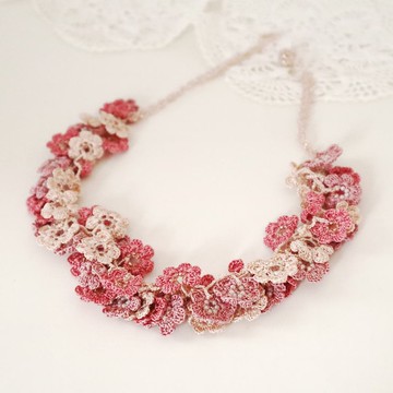 奢華地將多種圖案巧妙結合的項鍊。從其優雅、華麗的氛圍,我們將其命名為「Bijou」,意為寶石與珍寶。新款是…充滿小花圖案「Marie」的項鍊。圖案尺寸約為 1.5 公分。在 Oya 這種工藝中,圖案越小越難,為了呈現完美的造型,編織時必須一邊拉緊一邊細密地編織。滿滿的 60 朵小花。使用多種顏色製作,一款甜美又華麗的項鍊就此完成♪https://www.ayturk.biz/data/daisy-oya/product/20240321_283ebe.jpgBIJOU 系列: https://jp.pinkoi.com/store/ayturk?tag=BIJOU&i18n_tag=BIJOU材質:聚酯纖維 + 珠飾長度:55 公分--------------------------------------------------------------------------------Tül Oya ( तुळू ओया ) 是一種使用鉤針編織的 Oya 工藝。在卡帕多奇亞,Tül Oya 的製作自古以來就非常盛行。長久以來,Oya 工藝一直作為裝飾土耳其穆斯林女性頭巾邊緣的飾物而備受喜愛。在漫長的歷史中,Tül Oya 被寄予了女性們的願望與心聲,與其他 Oya 工藝相比,其圖案種類更多、變化更豐富。正因如此,Tül Oya 也是最能活用其多樣性來創造新設計的 Oya 工藝。使用尼龍或聚酯纖維線材編織出的圓潤圖案,散發出溫柔的暖意。