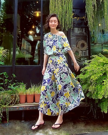洋溢著熱帶風情的大印花最適合夏天涼感的縲縈材質單肩微露,隱約的小性感左右兩袖刻意以不同造型呈現下擺鬆緊設計,是今夏最流行的短版上衣