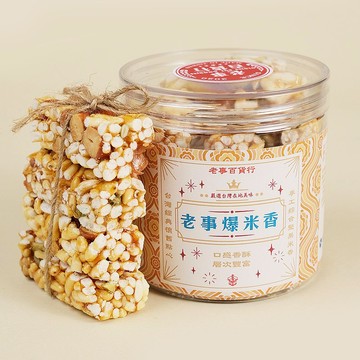 還記得街道巷弄裡的那聲:「爆米香要爆囉!」, 接著「砰」的一聲,空氣中彌漫著香甜的米香。老事爆米香以傳統工法製作,選用桃園大溪的整顆米粒爆香,加入新鮮花生、南瓜子、白芝麻,以純麥芽糖手工拌炒,不黏牙不膩口,口感層次豐富,兼具營養價值的堅果米香,讓人吃一口就停不下來!品 名:老事爆米香(全素)成 分:精選花生、南瓜子仁、米果、麥芽糖、大豆油、白芝麻、鹽。重 量:罐裝100公克±5%產 地:臺灣有效日期:日期標示在瓶身注意事項:1.本產品含花生、堅果、大豆類製品,過敏者請斟酌食用後可能導致過敏反應。2.請放置於陰涼乾燥處,避免陽光直射,開封後請盡速食用完畢,以避免產品受潮變質。-----------------------------------------------------在點心的世界裡,爆米香是與你的一份美好的記憶。「爆米香要爆囉!」一句記憶中的呼喊聲,伴隨而來的是撲鼻的香氣,讓你忍不住走近瞧一眼,再忍不住買一點來吃。童年的回憶依稀在巷口,讓我們的腦海再次迴盪那聲「蹦!」再吃上一口美好的記憶吧!