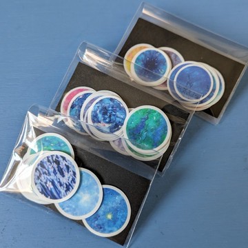 將星空系列作品《My Star Sky》及為展覽創作的作品,裁切成圓形製成散裝貼紙。共製作 30 種圖案,兩種尺寸。(大:直徑約 2.3 公分,小:直徑約 2 公分)每款分裝成 10 種圖案。內容請參考圖 2 及圖 3。*****・規格材質:半透明紙*每套包含 10 種圖案,每種圖案有大、小兩種尺寸,共 20 張。*庫存數量(截至 2025.06.22):A 套組 5 件・B 套組 7 件・C 套組 7 件(注意事項)此商品亦於其他電子商務網站販售。由於庫存管理為手動操作,偶爾可能發生庫存處理延遲之情況。敬請知悉。