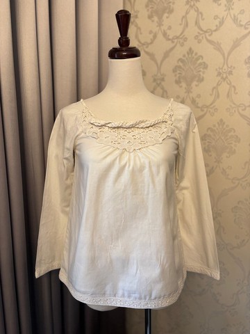 ·純白蕾絲方領小版型上衣·胸前的方領與連肩袖設計。·蕾絲與編織可調整鬆緊。·棉100%,印度製。·胸側有一污漬,即使送洗仍無法去除,雖不影響穿著然已反映於價格。·尺寸:(適合XS體型者穿著,或作為大童的上衣短洋裝) 肩+袖:54cm 胸:39cm 總長:56cm