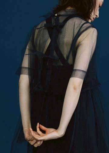 Meugler牛稠島 至愛羅蘭 白紗花邊絲帶刺繡海軍領黑色光澤背心裙