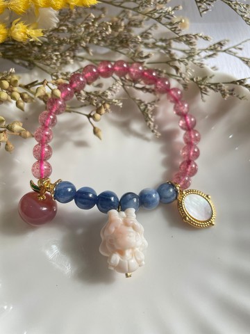 白雪公主在沉睡 女王貝藍晶石草莓晶手鏈手串白雪公主沉睡中的女王貝配飾搭配白雪公主代表色的藏青色藍晶石和鴿血紅草莓晶,再搭上代表著白雪公主故事的草莓晶蘋果和魔鏡配飾,就是故事中那還在等待王子沉睡的白雪公主。原創設計,請勿抄襲⛔️材質:女王貝(胭脂貝)、草莓晶、藍晶石、銅鍍金配飾女皇貝(女王貝、胭脂螺)是一種螺類,外觀是白、金橘色,內部為粉色。就像珍珠貝母一樣,通過輕輕地將隱藏在女人體內的魅力展現在表面上,從而賦予了別人所喜愛的力量。 對於每天追求“美麗”的人來說,這是一個完美的能量石,它不僅可以修飾外觀,還可以修飾內部,使其成為有吸引力的人。幫助懷孕的母親和撫養孩子的母親,放鬆身心撫平挫敗感並帶來柔和的感覺。草莓晶草莓晶主愛情與人際關係。也有增強愛情運勢,有助於吸引美好的姻緣、增加個人魅力、增進人際關係之功效。藍晶石藍晶石可使我們的溝通及表達更加流暢,同時加強邏輯思維,提升洞察力。它亦有助消除迷惑、不安、壓力等思維負能量,協助我們更透徹地了解事物,並勇於提出己見。對於學習和思考也有著正面的影響水晶、玉石功效因人而異,僅有穩定改善個人磁場功能,不具有醫療效果天然的水晶、翡翠、玉石、珍珠、貝殼就像人一樣,因為是天然,所以每一顆都是獨一無二的,就像每個人、每一段旅程、每一段相遇都是獨一無二的,無法複製、永不從來。日常保養❤️水晶、玉石、女王貝、珍珠類商品如長時間不配戴,可以以專業保養油或嬰兒油,以少量塗抹於表層做保養。❤️收納飾品時,請在避免高溫、陽光直曬的位置,請儘量以夾鏈袋密封乾燥、通風、陰涼位置做收納。