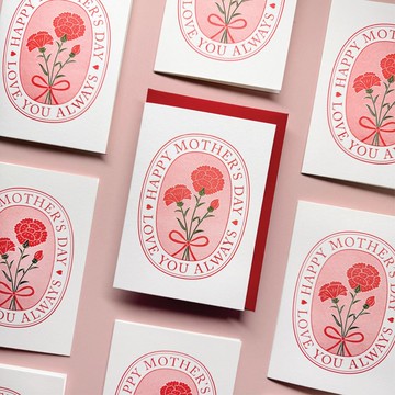傳遞永不過時的愛,用經典康乃馨與細緻壓印,為媽媽獻上一份溫柔的母親節祝福。搭配活版印刷讓畫面更有凹凸的立體感。內頁空白,附紅色信封一只。-尺寸:10.5x14.8cm|雙色活版印刷|母親節
