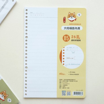 https://live.staticflickr.com/65535/46759523915_c51ff774e5_o.jpg⭐ Delivery is possible only if ordering over NT$100 (shipping fee excluded) , Thank you !⚠ 發票如果需要另外寄送請到以下商品頁補郵資費https://www.pinkoi.com/product/HeUp4qVk------------------------------------------------------------【商品規格】品名:柴之助 高效率系列 26孔活頁紙--大格橫罫 B5 編號:SFN-236 尺寸: 175 x 258 mm材質:紙--------------------------------------------------------------https://live.staticflickr.com/65535/54118121311_3feca459af_o.jpg/// 圖片皆以實體拍攝,但拍攝略有色差,請以實際收到商品為準 ///-⚠ 更多商品 ↓↓↓https://pinkoi.com/store/sunny-stationery...🚚【物流說明】● 貨到付運費地方:順豐速運● 台灣本島:黑貓宅急便● 台灣外島(澎湖、金門、馬祖):郵局(外島區域會視商品件數增加運費,若下單後有問題會再與您聯繫)● 非上述地區:郵局❗ 圖片皆以實體拍攝,螢幕顯示略有色差,若介意者請勿下單。