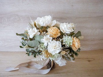 🙋**自然型捧花適合什麼場合?**相較於圓形捧花,自然型捧花不只有花朵,也使用了大量葉材做為搭配,所以擁有更多的層次感與空間感,很適合戶外婚禮或婚紗拍攝時使用,像森林、海邊、草地等地點都能有很好的拍照**【純白蜜橘】乾燥花手綁捧花****尺寸|**示範款為標準款,主花面寬約28-30cm,高約34cm**色系|**圖片示範色為白色調+蜜橘,亦可依照您的喜好客製配色(請先私訊)**花材|**主花為擴香索拉花,配花含不凋繡球花與其他季節性花材與葉材**備註|**1. 凡訂購捧花之新娘,享同款索拉乾燥新郎胸花加購價$200(每束捧花限購乙個)2. 客製商品交貨前都會拍給您完成品照,訂購後請務必每日上站留意我們的訊息**包裝方式|**捧花皆附贈捧花專用提袋乙個,可升級透明手提盒$150/個**自取地點|**新北市蘆洲區復興路上,近三民高中站2號出口(工作室無店面,請__事先與我們預約好時段__再過來取貨)**配送方式|**此款花禮僅提供郵寄/黑貓宅配寄送一律使用乾淨二手紙箱裝箱,過程中會確保花禮安全無虞送達寄送受限於物流狀況,偶有延誤1-2天的情形,建議事先預留緩衝時間**郵寄:**一般隔天可收到,不可指定時間收件,六日不送貨,運費$100/件**黑貓宅配:**一般隔天可收到,可指定上午1點前/下午6點前收件,週日不送貨,運費按體積計算$170~$240❗**訂購注意事項**❗◾ 商品皆採預約制,建議提前5~10天前預約,有急單需求可事先來信詢問是否能插單。◾ 天然植物素材,每一個大小、型態略異,成品皆無法100%與原圖相同,無法接受者請勿下標。◾ 如遇花況不佳或缺貨、斷貨情況,請允許花藝師更換同色系的類似花材做為替代🌸**關於乾燥花**🌸◾ 乾燥花是鮮花經由風乾處理而製成,主花則是使用削薄後的木片,染色後製成的手工花,價格較鮮花昂貴◾ 可保存時間約為1-2年,最佳觀賞期為製作好後半年到一年的時間,之後隨時間的拉長,可能有部分花朵會有退色或是掉落的情況產生◾ 商品不需要澆水,請置於乾燥通風處,忌潮濕、陽光直射,雨天時可開除濕讓花兒維持乾爽