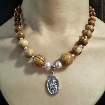 以色列進口項鍊・橄欖木&施華洛世奇珍珠・聖女小德蘭聖牌8231605