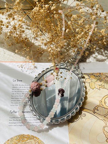 採用珠寶級精緻雕刻阿拉善瑪瑙九尾狐花球搭配粉晶,以翡翠提出高級感,使得整體作品貴氣提升,特別適合素面的穿搭,以細節的點綴提出整體精緻感。