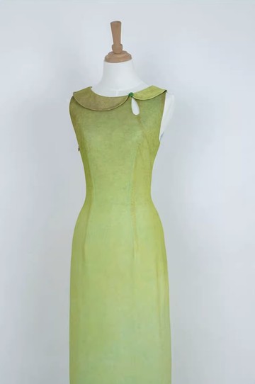 浮萍 扎染漸變綠色旗袍連身裙 手工製