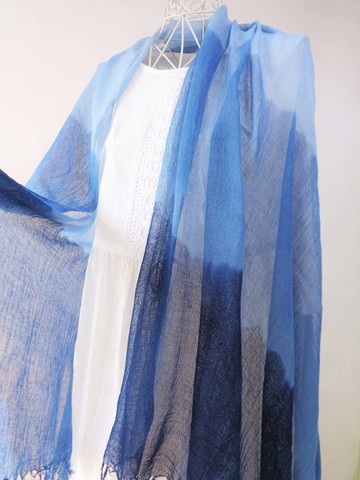 以三段漸層染製而成。尺寸寬度×長度約為120cm×196cm (含兩端約3cm的流蘇),重量100g。使用日本國產蚊帳布料手工染色,經過多次洗滌完成,觸感蓬鬆乾爽。越洗越洗,肌膚觸感會更加柔軟,即使是嬌嫩的肌膚也能安心使用。微風吹來時輕柔飄動,宛如羽衣一般。觸感變得溫柔地擁抱著,如同陽光穿透樹葉灑下的柔和光影。吸濕性也非常優異,非常適合換季時節。這是一款可以長時間使用的長圍巾。所有購買者都會隨貨附上一份簡單的「洗滌說明書」(備有日文與英文)。敬請把握這次機會,體驗來自大自然的禮物,享受自然溫柔的色彩。◎ 可在家中進行輕柔手洗。請使用無含漂白劑的「中性洗劑」輕輕按壓搓洗,用毛巾吸乾水分,整理好形狀後陰涼處晾乾。◇「一般寄送」也會妥善包裝後寄出。◇免費提供禮品包裝服務。請透過交易紀錄通知我們。◇寄出前,會使用蒸氣熨斗熨燙整理後再寄出。◇寄送完成後,會提供「查詢號碼」給您。◇每件商品均為手工染色、絞染等製成。可能會有微小的個體差異,敬請理解為獨一無二的商品。◇若有任何不明之處,請隨時透過訊息洽詢。※亦在其他平台販售。萬一遇上購買重複的情況,在與您聯繫後,將優先寄送購買時間較早的商品。敬請見諒。____________________寬度:約120cm長度:約196cm (含兩端約3cm的流蘇)重量:100g材質:日本國產・蚊帳布料 (100%純棉)染料:印度藍____________________產地 / 製作方式日本 / 手工製作◎ 植物染料可能會有輕微「褪色」情況。◎請避免使用洗衣機、烘乾機、漂白劑、含漂白劑的洗劑。◎為防止染色轉移,請單獨以少量中性洗劑「手洗」。◎植物染料長時間曝曬於陽光下、接觸柑橘類汁液、汗水、或是隨時間經過,顏色都會漸漸產生變化。由於是100%植物染料染色,敬請理解為自然的變化。◎請收納於避光處。◎購買者將隨貨附上一份簡單的「洗滌說明書」。使用少量「中性洗劑」(例如衣物柔順劑),輕輕按壓清洗。輕柔地衝洗2次,用毛巾吸乾水分後陰涼處晾乾。(全程約2~3分鐘)。熨燙請使用中溫,並隔著布料進行。(購買時注意事項)※所有商品皆為手工製作。請理解每件作品的顏色和形狀會有些微差異,皆為獨一無二。※購買前請務必仔細確認商品的「尺寸」與「材質」。※畫面上的顏色可能與實物有些許差異。※100%天然染料,手工染色,每件皆獨一無二。可能會有細微的色差,敬請見諒。※若有任何不明之處,請隨時與我們聯繫。