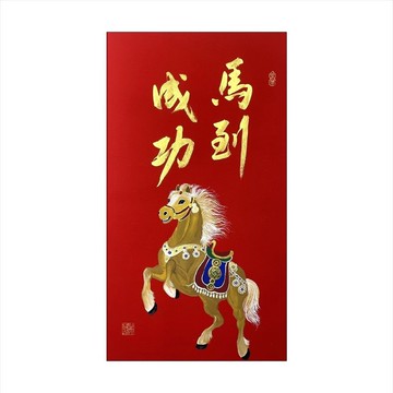 【馬到成功】征戰時戰馬一到便獲得勝利。比喻成功迅速而順利。這表達了人們追求年年順利獲得成功的美好願望。 {成品尺寸} W38cm * H69cm張張手寫手繪 (絕無印製.絹印) 只做最好的手工春聯