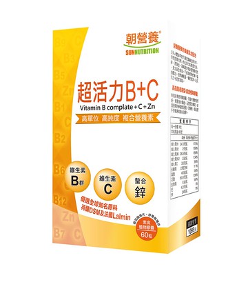 提升防護必備,讓身體產生保護力一次滿足8種水溶性維生素B群、C及鋅促進新陳代謝,增強體力,精神旺盛男女適用,天天1-2顆,安全又穩定營養醫學的強健活力配方提供人體必需的八種完整維生素B群,搭配抗氧化劑-維生素C與微量元素-鋅,高單位、高純度的複合營養素補充,更加安全有效。可促進新陳代謝、增強體力,使精神旺盛,維持健康,天天活力十足富朝氣。精選優質原料•荷蘭DSM維生素B群及C:採用國際知名大廠帝斯曼(DSM)生產的優質水溶性維生素。維生素B群除參與能量代謝、維持神經系統及皮膚健康外,B6、B12及葉酸還與紅血球正常與形成有著重要的關係。維生素C能促進膠原形成、參與體內氧化還原反應、維持結締組織、骨骼及牙齒的生長、促進鐵的吸收。•法國Lalmin®鋅酵母:採用全球領導品牌並且具多項國際認證鋅酵母。微量元素鋅經天然酵母螯合成最有利於人體吸收的胺基酸螯合型式存在,吸收率高。鋅為胰島素及多種酵素的成份。參與核酸及蛋白質合成及能量代謝。 高品質易溶型-素食植物膠囊有別於傳統明膠膠囊,不含有動物性成份,而且含水量低,品質安全穩定,對營養素的保護性更佳。溶解快,更能提升營養素的吸收效率。安心品質保證•無添加香料、防腐劑,不打錠,減少不必要的食品添加物•由ISO22000、HACCP認證工廠製造•本產品已依法投保產品責任險•食品查驗登記證核准品 名:朝營養® 超活力B群+C,鋅 膠囊成 份:維生素C、本多酸鈣、鋅酵母、維生素B1、維生素B6、維生素B2、菸鹼醯胺、硬脂酸鎂、二氧化矽、葉酸、生物素、維生素B12 膠囊成份:羥丙基甲基纖維素、純水、鹿角菜膠、二氧化鈦、氯化鉀、氧化鐵內 容 量:615毫克/粒,60粒/盒食用方式:早餐後,搭配溫開水食用。建議用量:每日1-2粒,每次1粒。保存方式:置於陰涼乾燥處,避免光照。開封後請儘快食用完畢。有效日期:西元2027年01月14日保存期限:三年 原 產 地:台灣全素食品本產品已投保產品責任險三千萬