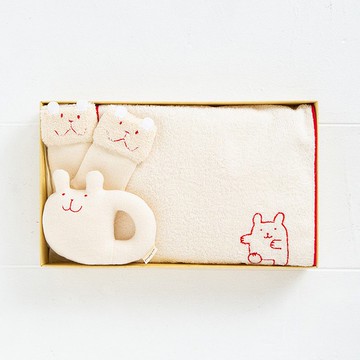 禮品組 SB 100% 有機棉搖鈴、襪子、毛巾 3 件組 嬰兒洗澡禮物 兔子熊 日本製造
