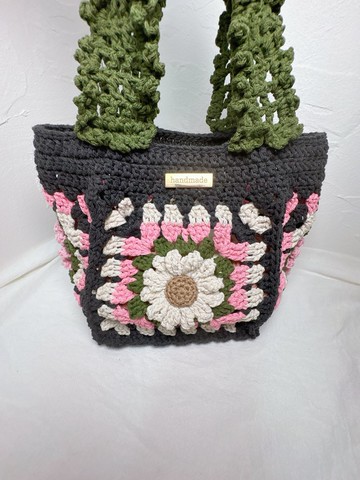 手作鉤針編織包包 撞色小花花手提包 長皮夾ok 附掛件小包