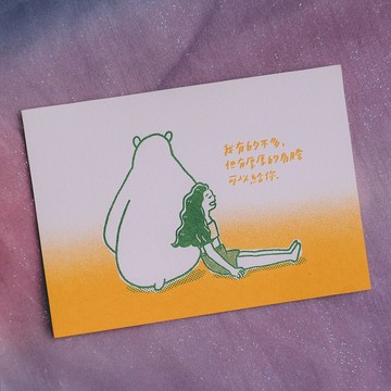 **❁ 肩膀給你躺一次300 ❁**「我有的不多,但有厚厚的肩膀可以給你 」「躺一次 300 元」這張圖的https://www.pinkoi.com/product/cXcxKdfg (原版),是在做第一批明信片的時候畫ㄉ,那是我開始畫插畫、做品牌的草創期,一切都很辛苦,沒什麼作品、沒什麼商品、也沒什麼人氣,出攤都會賠錢的那種。但那時我身邊有個很像大白熊的人,他的肩膀厚厚的,陪我度過了很多難關,是個神奇ㄉ時期!一直到現在都還是很感謝他,儘管身邊的人事物總是來來去去,還是會有些重要的東西留在心中ㄅ。隨著日子成長,身邊的風景改變,畫風也一直都在變。因為現在的風格跟以前實在差太多了,原本想直接淘汰這款明信片(甚至會有客人覺得是不同人畫ㄉ..),但覺得換一種形式留下這些感謝的心也滿好的💖畢竟那也是組成我這個人的一部份ㄚ~選用✨溫潤木質紙✨(最近ㄉ新歡),像是塗了薄薄一層的奶油,很溫暖的顏色ㄛ微微粗糙的觸感,質感一百分💗**• 以明信片方式販售,並沒有附個別信封袋和貼紙唷!** **\關於印刷方式:孔版印刷小知識/**孔版印刷有點像是版畫或絹印,每個顏色都是獨立版印刷的,因此會造成錯位、疊印的效果,印出來很自然的復古,大愛💓**❁ 關於這張卡 ❁**• 10.5 x 14.8 cm• 溫潤木質紙 235g,適合書寫• 雙面雙色印刷• 印刷品本人和照片會有些微色差唷!• 愛地球,包裝並沒有個別附塑膠套,真的有需要的人再跟我們講一聲唷~-**・關於黑白小姐・**一黑一白的兩個好朋友共同創立,小小的身體做著大大的夢,想要保護地球、保護流浪動物、保護每一個善良而脆弱的靈魂。「用插畫描繪喜歡的生活樣貌,保持寬闊的心,像山海一樣,自由自在。」想發揮一點點溫柔而堅定的影響力,溫暖世界上那些不那麼美麗的地方,就像她們對彼此一樣。也想帶給你大大的勇氣,過嚮往的生活,接受自己不完美、世界不完美。慢慢的、不用太急的,成為自己喜歡的模樣。**・我們賣什麼・**明信片|讓旅行中的所見所得,成為你我的養分。 人像畫|讓我把你的幸福、快樂畫下來吧。插畫周邊|只要有一秒你被療癒到,那應該就值得了。