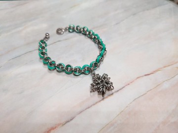 以一個一個的不鏽鋼單圈串接成一條手鍊,作工耗時,但成就為你所獨有的飾品<材質>不鏽鋼單圈+綠色橡膠軟圈<說明>*總長度約18公分。星星墜體寬約2cm。**單手就能扣-鍍白K壓扣***商品含收納夾鍊袋一只。關於不銹鋼:1.抗腐蝕,不易氧化變色。2.不易過敏,對電鍍材質過敏的人有福了~^^。3.以一般清水清洗,再擦乾即可,很適合易流汗的朋友。(若有污漬,則用不含油性之清潔劑~如洗碗精清洗, 但需考慮同一作品上之其他材料,若有加不適合碰水的材料,則以微濕的濕布擦拭即可)4.若需長時間碰水~如洗澡或洗溫泉時,仍建議先取下,避免產生水垢;不鏽鋼本體不會生鏽,但搭配的其它素材,仍不適合長時間碰水。<<其它>>*不配戴時,請放進夾鍊袋存放**此為一個個的單圈製作,接縫處難免有不平,請儘量勿搭配蕾絲類衣物。