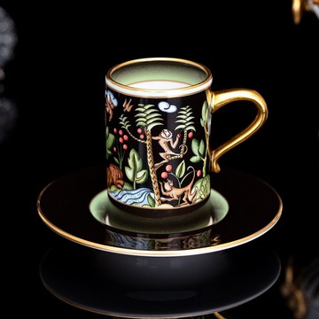 **Fine Bone China|Made in England**來自英國百年瓷器品牌 Minton 的經典之作,此款 Monkey Tree 系列於 2007 年發表,以歐洲童話視角描繪熱帶森林中的靈動生靈,透過細緻描繪與飽滿色彩,營造出充滿童趣卻極具藝術力的自然場景。【品牌】:英國Minton(明頓)【產地】:Made in England英國製【材質】:(Fine Bone China) 高級骨瓷【尺寸】:杯口徑5cm*杯高7.5cm*碟11.5cm 容量適合義式濃縮 Espresso【年代】:2007年【狀況】:全新 / 禮盒裝**主題設計**杯身以金彩勾勒邊緣,主體色調為沉穩黑底,襯托鮮明的森林圖騰:靈猴穿梭林間、猛虎臥伏溪畔、山鹿緩步林下,每一側面皆如童話插畫般生動。此款設計不僅富有收藏價值,也為日常飲用濃縮咖啡增添一份儀式感。