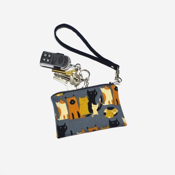 <商品介紹>-\t拉鍊開合。-\t鑰匙包內側有一開放式口袋,可置放感應磁卡或其他卡片。-\t可容納遙控器,長型鑰匙也放得下喔!-\t附有活動式腕帶,可套於於手腕上。-\t可當零錢包使用,多用途收納小包。<材質>厚棉布貼襯、帆布、鑰匙圈金屬配件、金屬鈎扣、YKK拉鍊。<尺寸>高約8cm,長約12.5cm腕帶長約15cm(不含五金配件-鈎扣,腕帶長度無法調整)<洗滌說明>建議手洗。洗滌時請先將金屬配件卸下。請勿乾洗或漂白。手工製作,非機器大量生產,每個手作品的圖案會因布樣之剪裁取布而圖案位罝不同,所以,每個手作品都是獨一無二的圖案。商品顏色可能因拍攝環境、光線與電腦螢幕設定不同, 而產生些許色差,以實際商品為主。產品為手工製作,顏色尺寸規格可能會有些許差異。產地台灣 手工用心製作