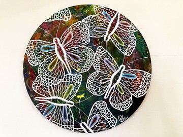 蝴蝶繪畫《像蝴蝶一樣生活 6》butterfly painting - Live Like A Butterfly 6 這是我們、你們、牠們、它們的地球,一切生命的家。 萬物分享星球,在自己的天地存活,純粹地相信與尊 重。此刻牽起了手,成為豐富彼此的力量,親吻大地, 輕輕地走過星球。蝴蝶身型猶如人類的蝴蝶,被造物者賦予蛻變的使命,一生歷經多次轉變,穿越土地與藍洋,享用大地的養份,回饋為花授粉,精彩走過一生。畫者藉此鼓勵自我突破與轉變,無論有形或無形,並提醒身為地球一分子的人們,以同理心尊重萬物、共享資源、給予回饋。蝴蝶美麗、輕巧而自由,千萬個世代輕輕地走過地球。當萬物快樂自在地生活,代表大地富足與純淨,我 們更能真實地分享純粹的喜悅。埋下一顆「親‧輕 走過地球」的種子,在心中發芽茁壯。 尺寸:直徑 50 cm媒材:畫布、壓克力顏料**所有電腦和手機的顯示顏色都不相同,畫作可能與您在屏螢幕上看到的圖像顏色略有不同。**