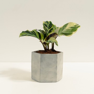 **油畫竹芋│Goeppertia louisae ‘Thai Beauty’│****◼︎ 植物介紹**由葉緣至中心,層層堆疊的羽毛斑紋,從翠綠、深綠再到黃金的奶油色,充滿活力的濃烈色彩,有如美麗的油畫,令人賞心悅目!https://s3.ap-southeast-1.amazonaws.com/cdn.store-assets.com/s/809128/f/10161690.jpg**◼︎ 商品內容**植株高度:約16cm盆器規格:三寸六角盆,直徑9cm、高8.5cm材質:白水泥包裝:紙盒包裝**◼︎ 光線指南**喜歡明亮的散射光,須避免被過強的陽光直射,以免葉片燒傷,而呈現黃褐色,影響它們的美觀。**◼︎ 澆水指南**平時在室內環境,大約一週澆水一次,可觀察土壤表面微乾後,再一次澆透,不過仍需觀察實際狀況做調整,夏季時水分蒸散較快,可能會縮短澆水間隔。 **◼︎ 推薦加購**特製通用介質https://www.pinkoi.com/product/5Ry7zgRuhttps://cdn01.pinkoi.com/product/5Ry7zgRu/1/800x0.jpg *小提醒:由於農場大規模栽培,難免會有些許葉傷,出貨時會盡量挑選,但無法確保葉片零瑕疵,可以接受再下單喔!