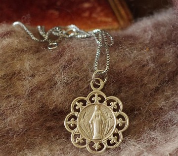 購自法國之銀色聖母項鍊。超美花型,尺寸也很棒,適合天天配戴。墜頭上有一個不明顯的鋼印。材質很像是純銀,但因為鋼印看不清楚,所以就當作是銀質。正反兩面都可以配戴,其中有一面有1921年的年份。總鍊長40公分,墜子直徑1.8公分。古董飾品因為年份關係,請使用完後,放到夾鏈袋保存。勿戴著淋浴、游泳等水上活動。正常使用,壽命久久。